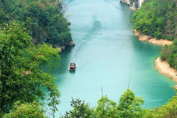 一艘画舫船行驶在阿蓬江大峡谷景区江面上,隽秀的峡谷、如蓝的江水、青青的翠竹、如黛的苍山,让峡谷宛如仙境。阿蓬江大峡谷是今年1月1日向游客全新开放的峡谷生态自然景区,眼下正值春暖花开,峡谷绿树成荫,秀美如画,简直美不胜收。