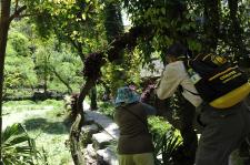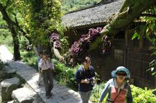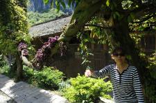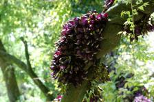 “棉麻藤”上,从根部开始就开满颜色为紫色的“鲜花”。有的一串一串,有的一团一簇,远看如晶莹剔透的葡萄,挂满整根藤蔓。据景区工作人员介绍,这根“棉麻藤”是1998年桃花源开发打造时从乡下购买栽植到景区的。10余年来,如一条粗壮的蟒蛇,将攀附的柳树缠绕得严严实实。从根部直径50余公分分析,这根棉麻藤至少有200余年的“年龄”。