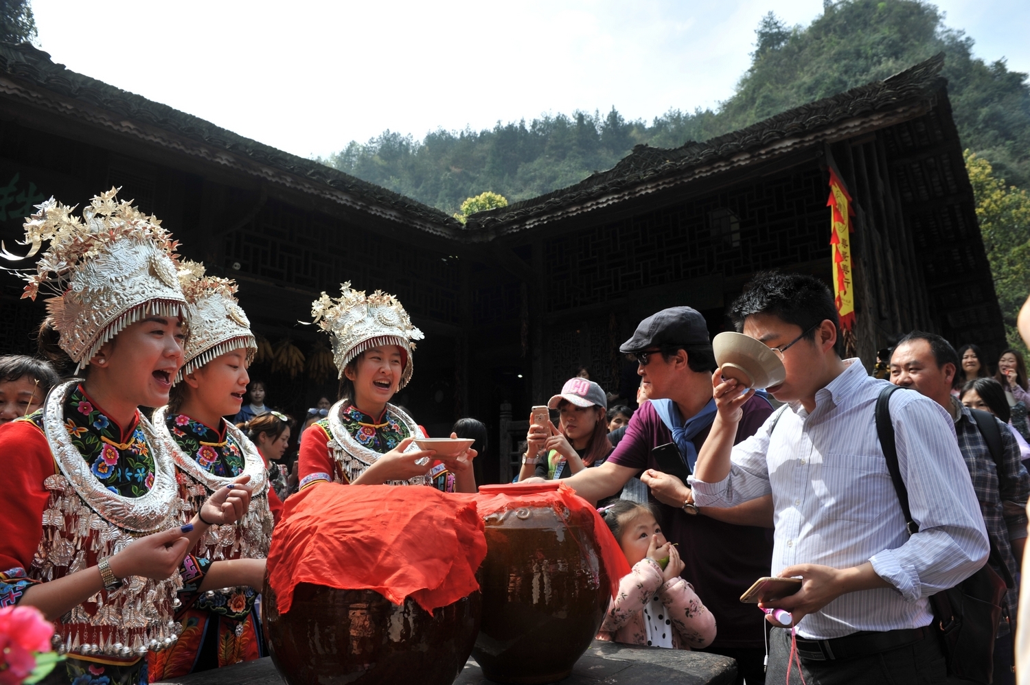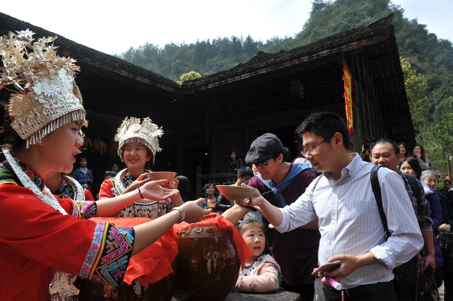 “拦门酒”是土家族一种非常隆重的礼节,是迎接贵客时的一种传统仪式和古老习俗。贵客到达寨门口或家门口的时候,主人家在门口摆上自家酿的美酒,并双手端上一碗迎向客人,然后客人喝上一两口或整碗喝下,以这样的方式表达对客人的尊敬。桃花源景区在古桃源的潜村和酉州古城北门,都会摆上一桌的美酒迎接远方来的贵客。