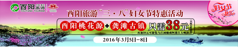 据了解,此次特惠活动将在3月5日-8日进行。在此期间,凡来酉阳旅游的女性游客,只需38元即可游览桃花源和龚滩古镇两个景区。在此基础上,每位女性游客只需另加38元,即可乘坐游船游览乌江画廊或阿蓬江大峡谷景区。对于男性游客,只需在微信里发一张桃花源景区的照片,附上景区“世界上有两个桃花源,一个在您心中,一个在重庆酉阳”的广告语,积满138个点赞,即可和女性朋友一样,享受同样的“三・八”优惠政策,并参与抽奖。让男性游客和自己心爱的爱人,在阳春三月这个姹紫嫣红的季节,远离雾霾都市,畅享“酉阳大桃源”的清新和愉悦。